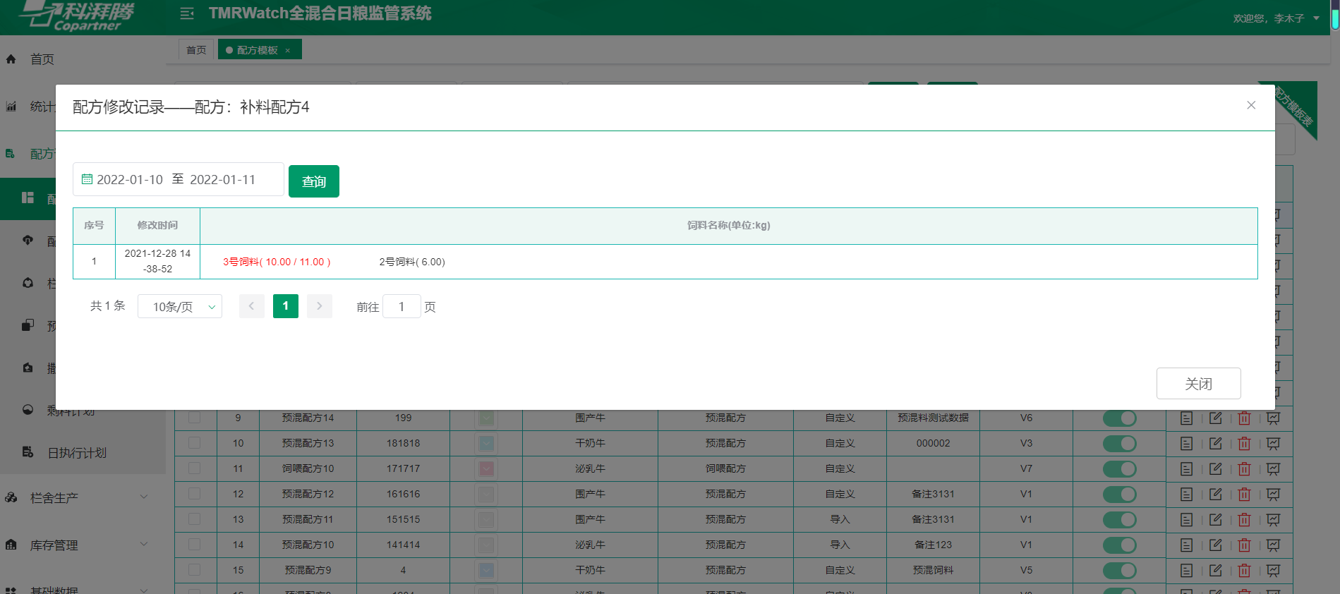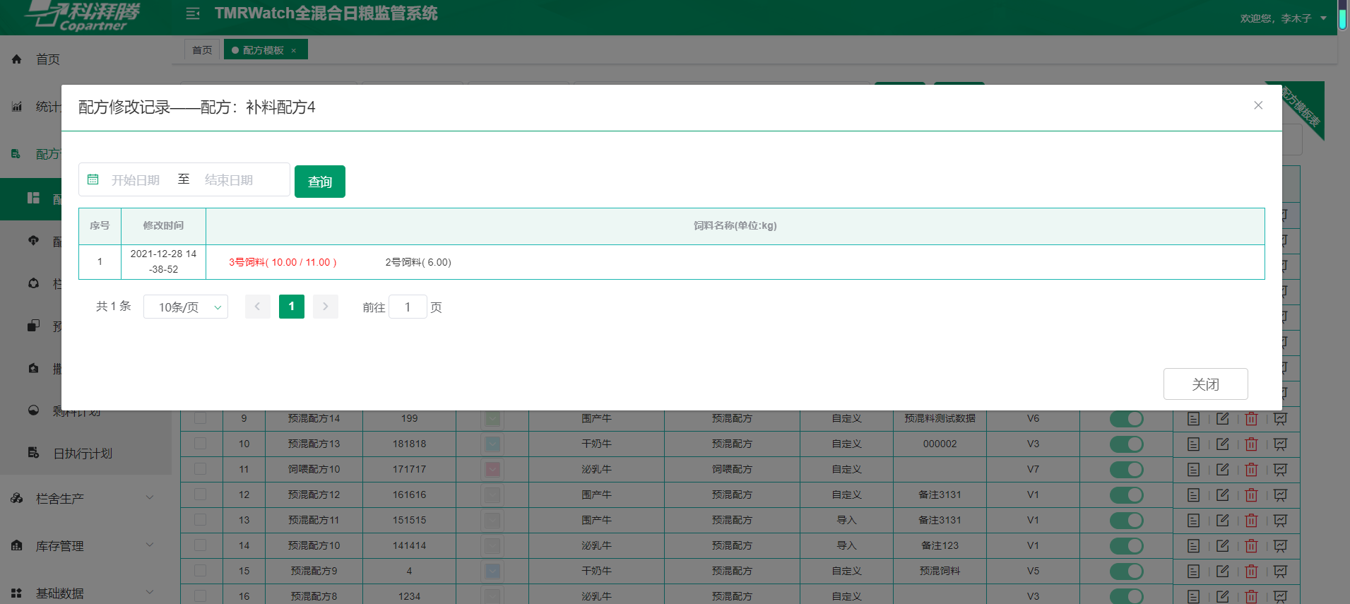 配方计划--配方模板 点击配方修改记录,时间筛选有误